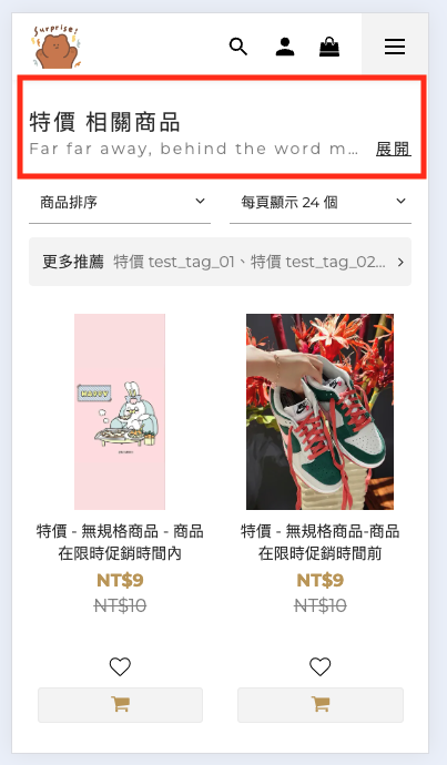 手機版本的商品屬性標籤頁,在使用者將頁面向上滑動時會顯示 sticky bar,若先前有客製化過頁首,可能會導致顯示的位置有偏誤,可以透過以下的區塊調整 sticky bar 顯示的邏輯